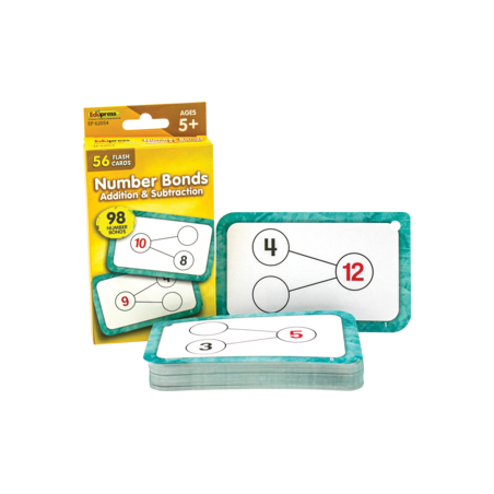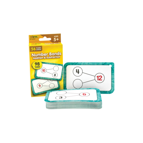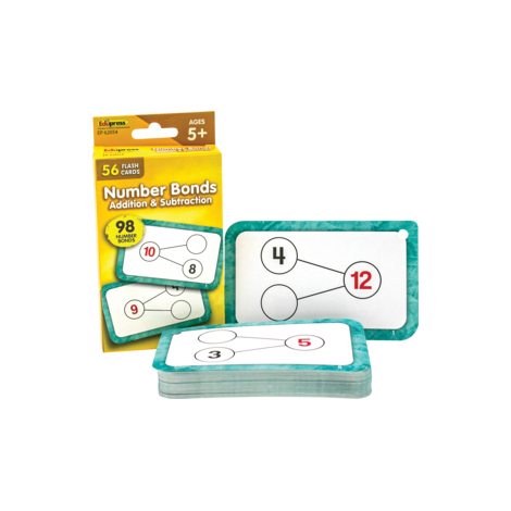 Master addition and subtraction math facts simultaneously with these number bond flash cards. Every set contains a collection of full-color, high-interest student cards, as well as instructions and tips for the teacher or parent, along with suggested activities. Each card has a hole in the top corner for use with a ring or string to help with organization and storage. Additionally, each card has one corner that is shaped differently than the others. By lining up the non-rounded corners, the flash cards can quickly be faced in the same direction. Each card measures 3⅛" x 5⅛". 56 double-sided cards per pack.